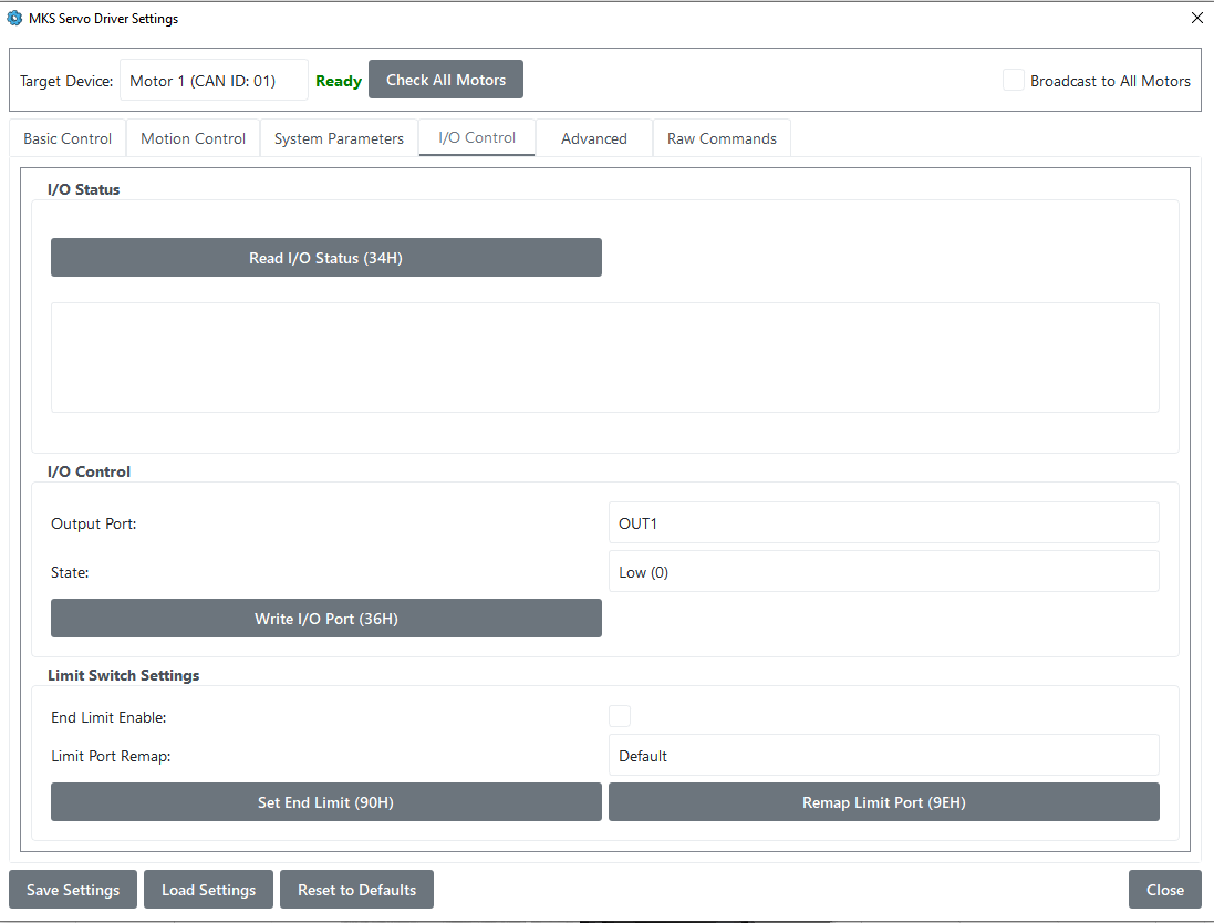 In contrast, for MKS42D boards (Z, A, B, and C axes), you must remap the input pins to enable the use of two limit switches (Home and End Limit) by sending the serial command 9E (e.g., hex 03 9E 01 A2 for ID:03) using a Arctos Studio/Settings tab/MKS settings/IO Control. After successful remapping, the “GoHome” function will recognize the sensor input, and you still need to ensure limits are enabled via menu or serial command 90 for the End Limit function to stop the motor in the opposite direction.