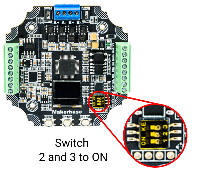For MKS57D boards (X and Y axes), remapping is not necessary as they natively support two limit sensors (IN_1 and IN_2). However, you must enable power to the sensors by ensuring that DIP switches 2 and 3 on the MKS57D board are flipped to the “ON” position, which is a common oversight. Once powered, you must also enable limits either through the on-board MKS menu (“EndLimit”) or by sending serial command 90.