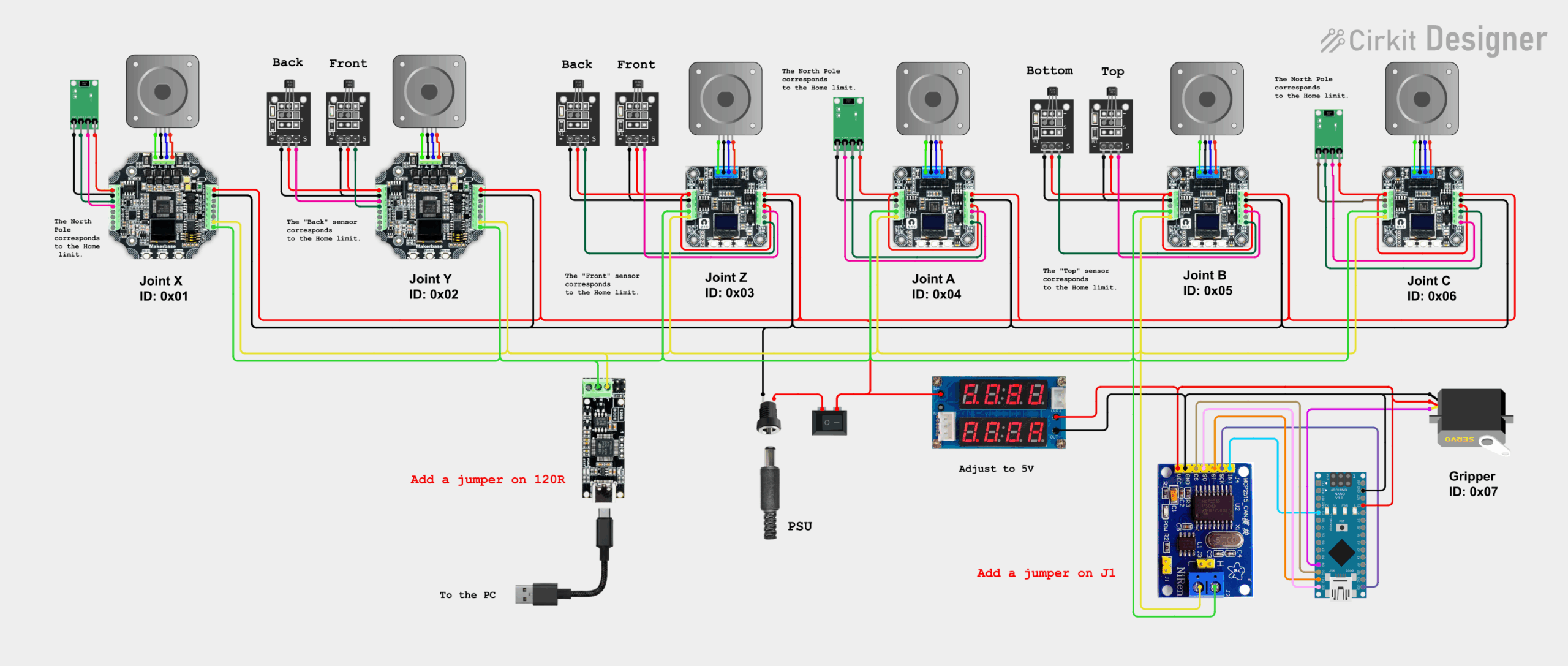 Configure each MKS Servo driver to these settings. CAN ID – Axis: 01 – X, 02 – Y, 03 – Z, 04 – A, 05 – B, 06 – C.